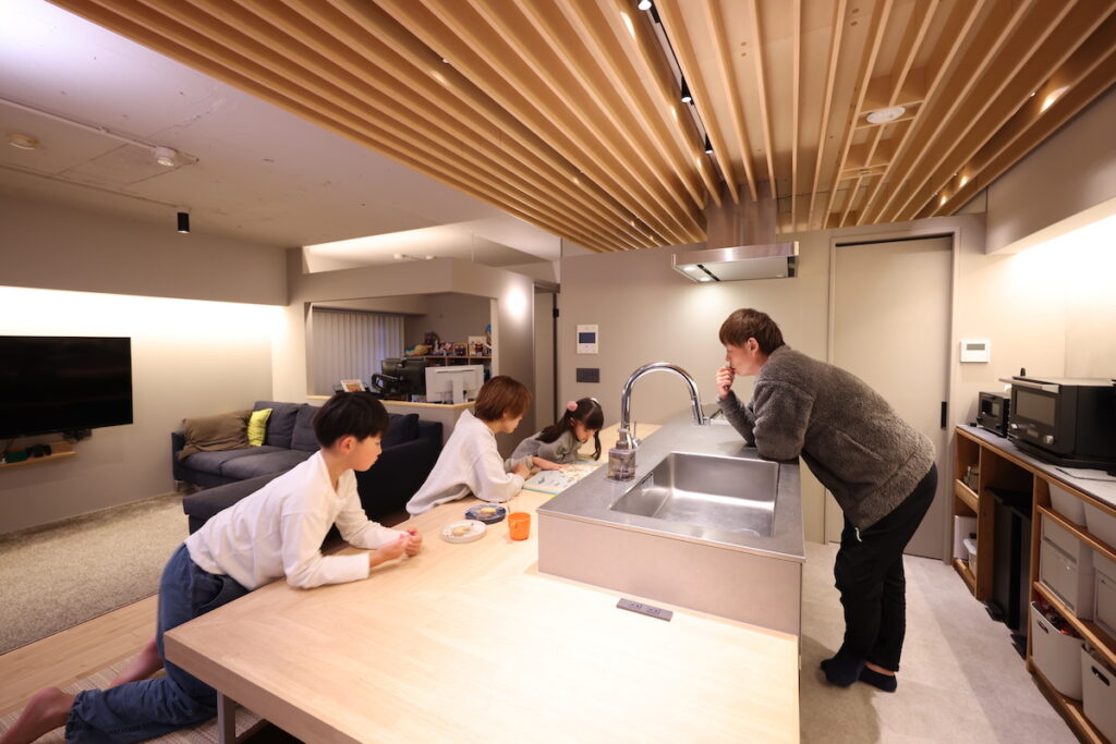 オープンキッチンのまわりには、家族や友人が自然と集まるカウンターや畳ベンチ。
