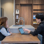 ダイニングテーブルは、持ち込み予定の家具をキッチン横にレイアウト。料理したものをすぐに手渡しできる動線と距離感で、配膳や団らんがスムーズに。キッチンと一体化したような使い勝手の良さが特徴です。