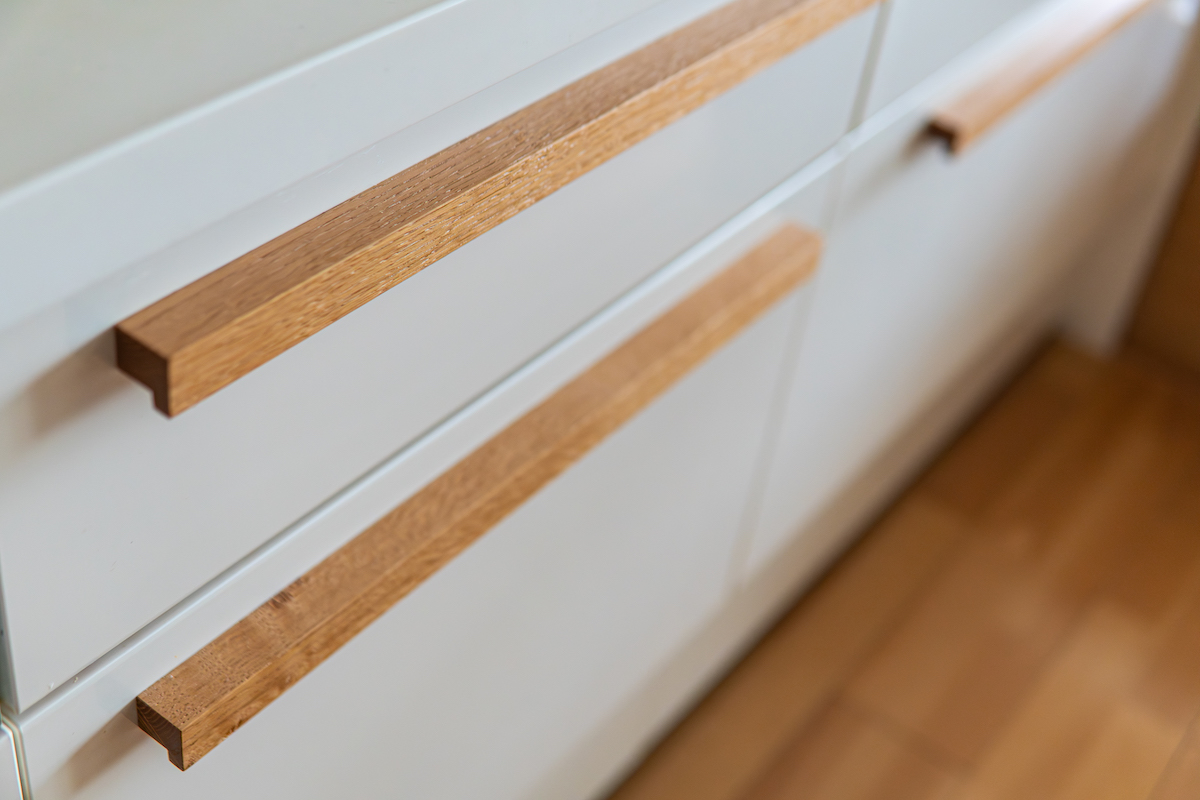 今回は、空間全体の雰囲気に合わせて木製の取手を採用。素材の経年変化を楽しめたり、無垢材や塗装面との相性がよかったりと、空間にさりげない個性を加えてくれます。