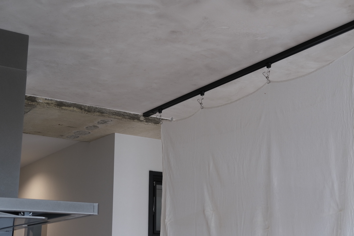 壁や扉でしっかり仕切るのではなく、やわらかく区切る “間仕切カーテン” を採用。
