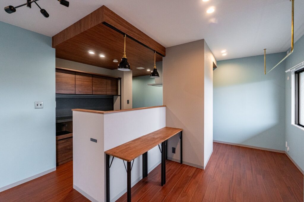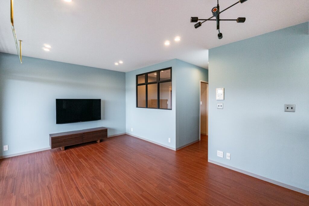 キッチン前の壁をなくして圧迫感を解消し、室内窓で奥行きを演出。さらに壁全体を水色に仕上げることで、憧れていたドラマのような世界観を楽しめるリビングになりました。機能性とデザインが融合し、毎日が気持ちよく過ごせる空間へと生まれ変わりました。