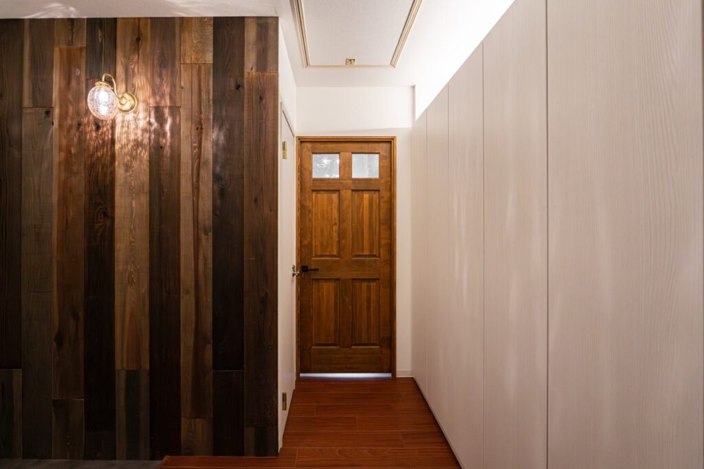 玄関には、実際に見て選んだ古材を貼り、唯一無二の風合いが毎日の帰宅を迎えてくれます。