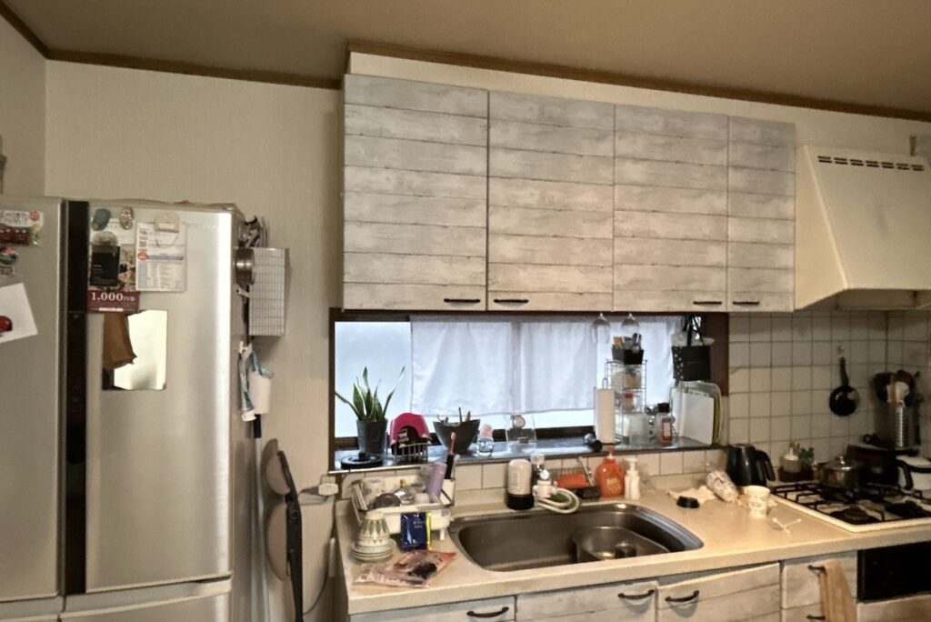 出窓をふさいだ食器棚は、扉に乳半アクリル板を用いることで
