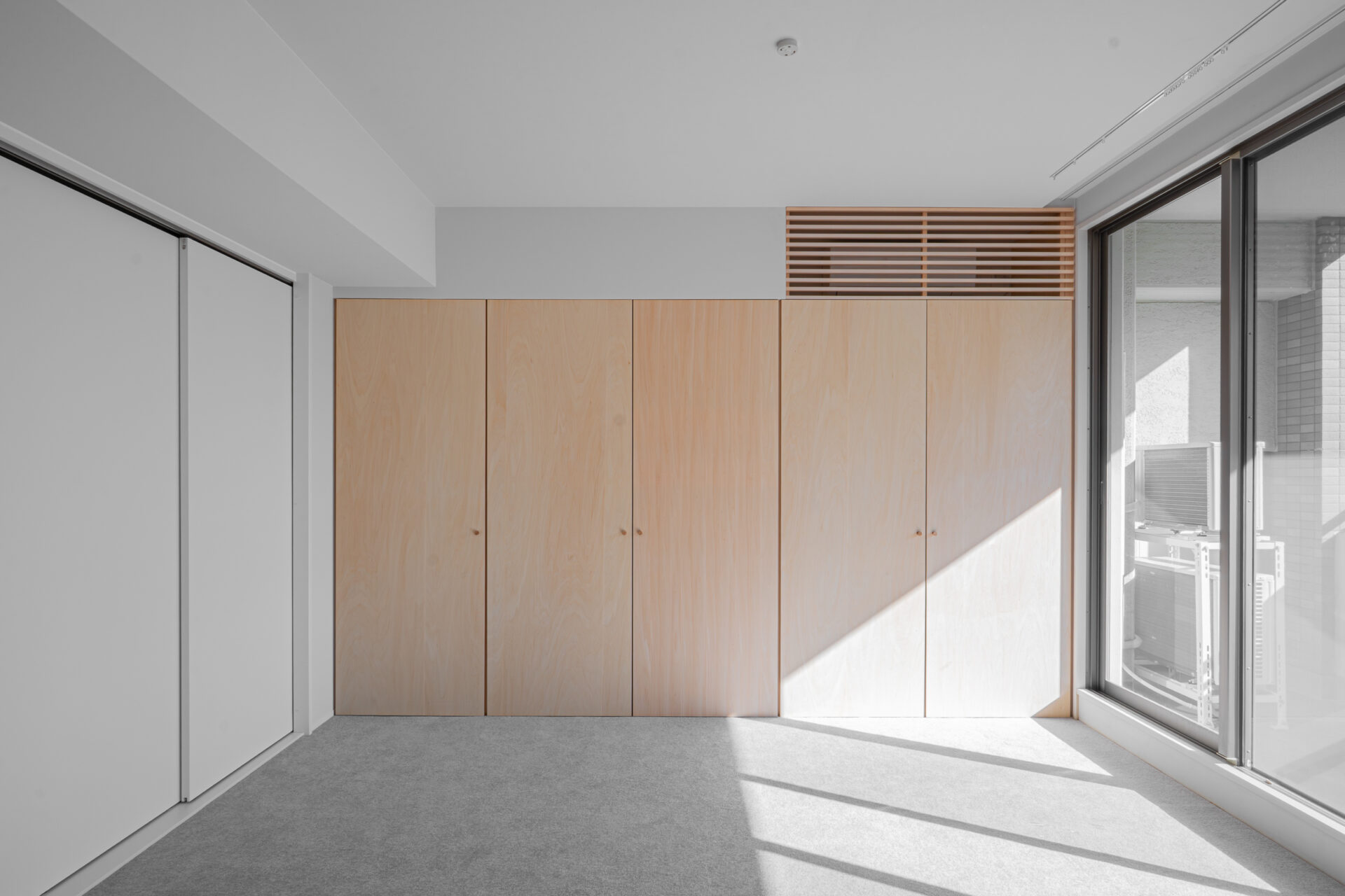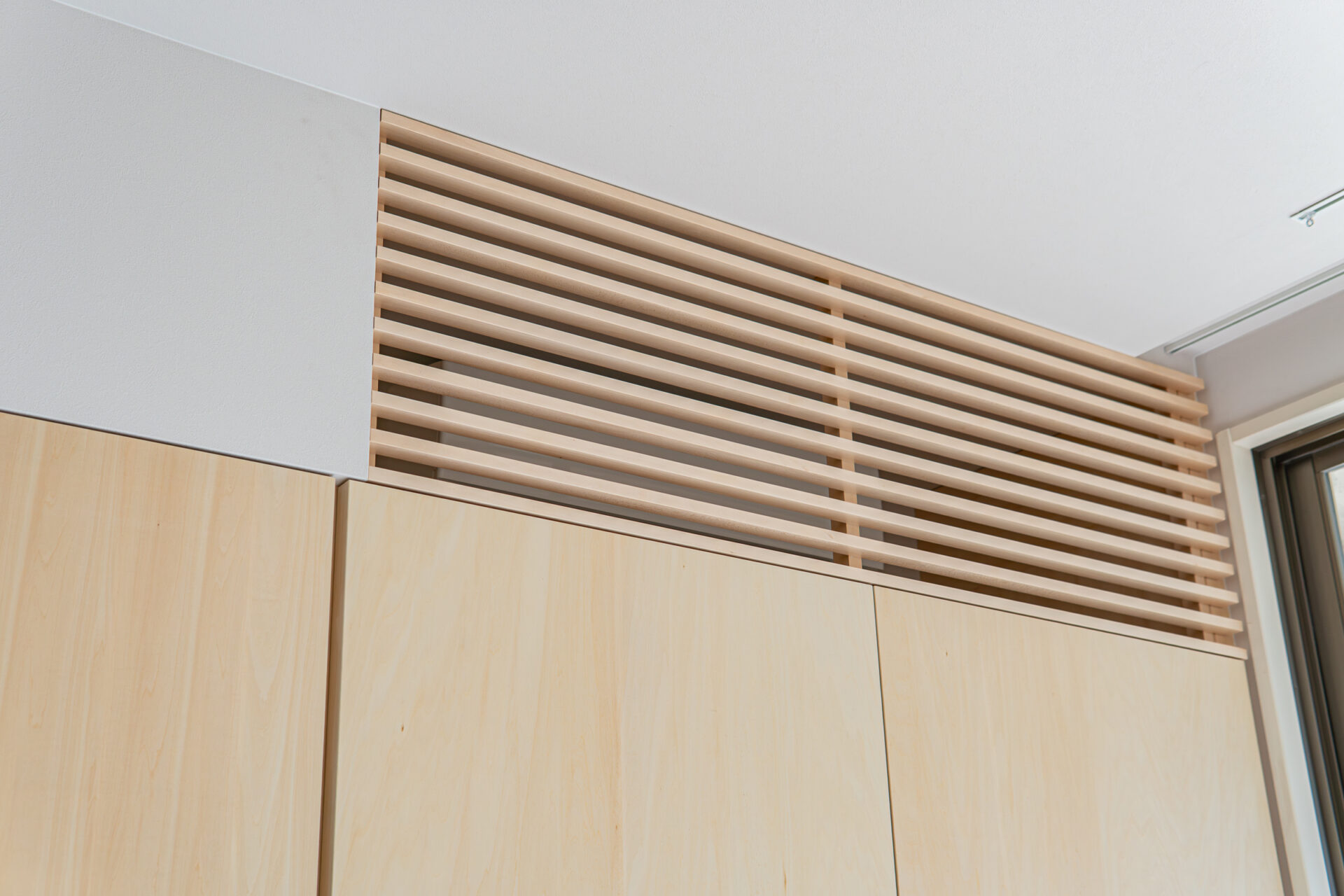 エアコンはルーバーで包み、収納上部に納めることで、壁面のノイズを抑えました。